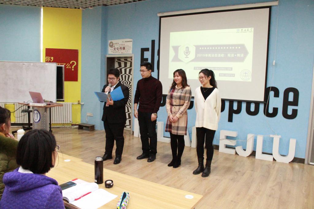 分团委副书记乔敬时、分团委干事刘琦、杜伟桐、王思琪等,在吉大南岭校区创客空间与管理学院的同学一起举办了宪法日教育活动。