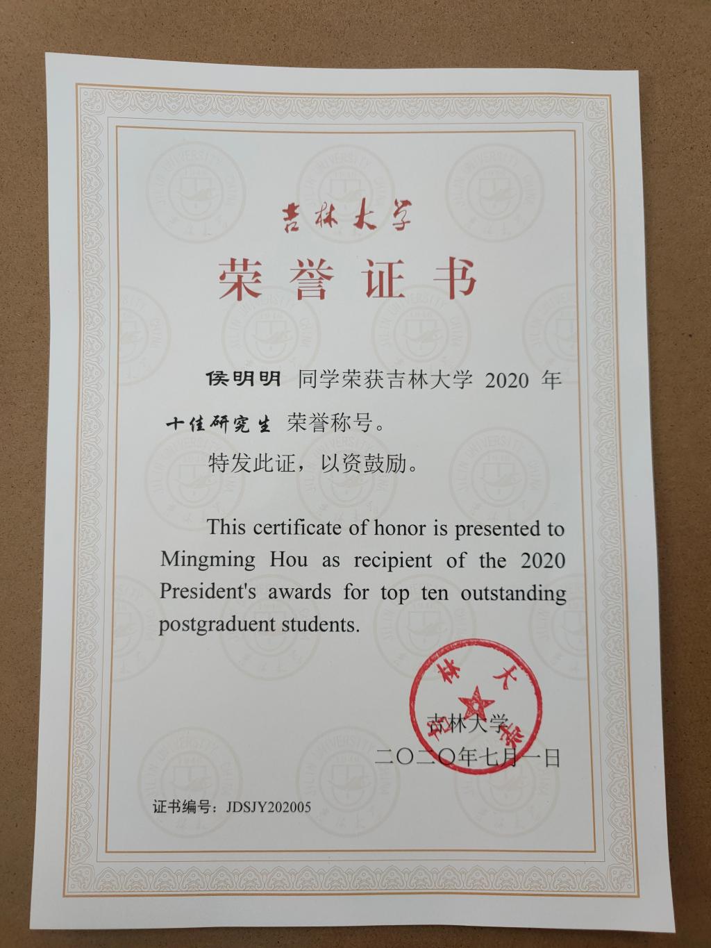 2020年十佳研究生”荣誉称号!