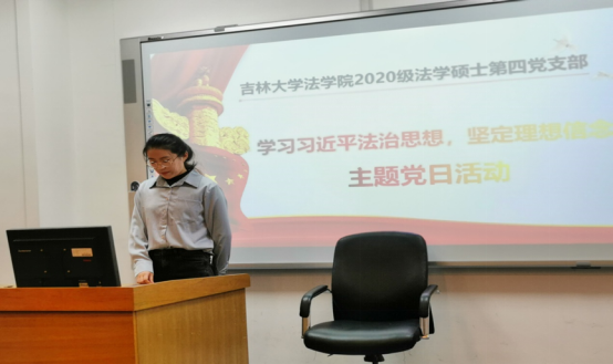 接着,2020级法学硕士第四党支部刘诗雯同学以“法学研究生在法治中国新时代下的政治使命和社会责任”为主题进行了发言。刘诗雯同学从法治中国的新时代背景切入,对法学专业研究生应肩负起何种政治使命和社会责任发表了自己的感悟。她认为,作为法学专业研究生,应培养“天下为公”的家国情怀,在法律职业工作道路上不忘初心,砥砺奋进,为实现中华民族伟大复兴的梦想不懈奋斗。