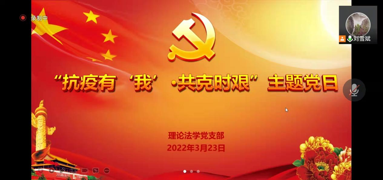 理论法学党支部积极落实学院党委疫情防控期间的工作安排,于3月23日晚举办“抗疫有我·共克时艰”线上主题党日活动。支部成员刘雪斌、杜宴林、宋显忠、钱大军、苗炎、侯学宾、杨帆、郑怀宇、乔楠、黄伟、杨雪通过线上方式参加。主题党日活动由理论法学党支部书记刘雪斌主持。