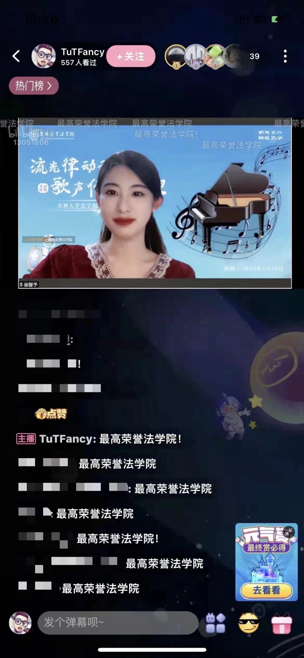 同学600余人通过腾讯会议、Bilibili直播间观看了晚会,并通过弹幕、群聊等形式踊跃参与晚会互动。