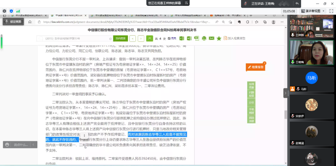 线上师门小课的形式具体由:主题展示,交叉提问,教师辅导,共三部分组成。其中主题展示是指由主讲同学事先自主学习王艳梅老师指定的内容,熟练相应知识点的内部逻辑与理论外延,预先准备应对可能提出的学术问题,并就所学内容提出个人观点,最终汇总制作成 ppt 形式,向老师与同学作出汇报。在已经召开的三场线上师门小课中,主要围绕以下主题开展:(1)着眼于新法速递的林新同学主讲的《公司法(修订草案)征求意见》的条文解读、曲靖翘同学主讲的《民事诉讼法》(2021修正)条文解读、宋修伊同学主讲的《最高人民法院关于适用<中华人民共和国民法典>总则编若干问题的解释》;(2)前沿问题探索,由孙永敏同学主讲的《最高人民法院关于审理使用人脸识别技术处理个人信息相关民事案件适用法律若干问题的规定》;(3)近两年商事类最高院指导案例的剖析,由王梓烨同学主讲的指导案例161号、178号,于嘉同学主讲的指导案例163号、164号。