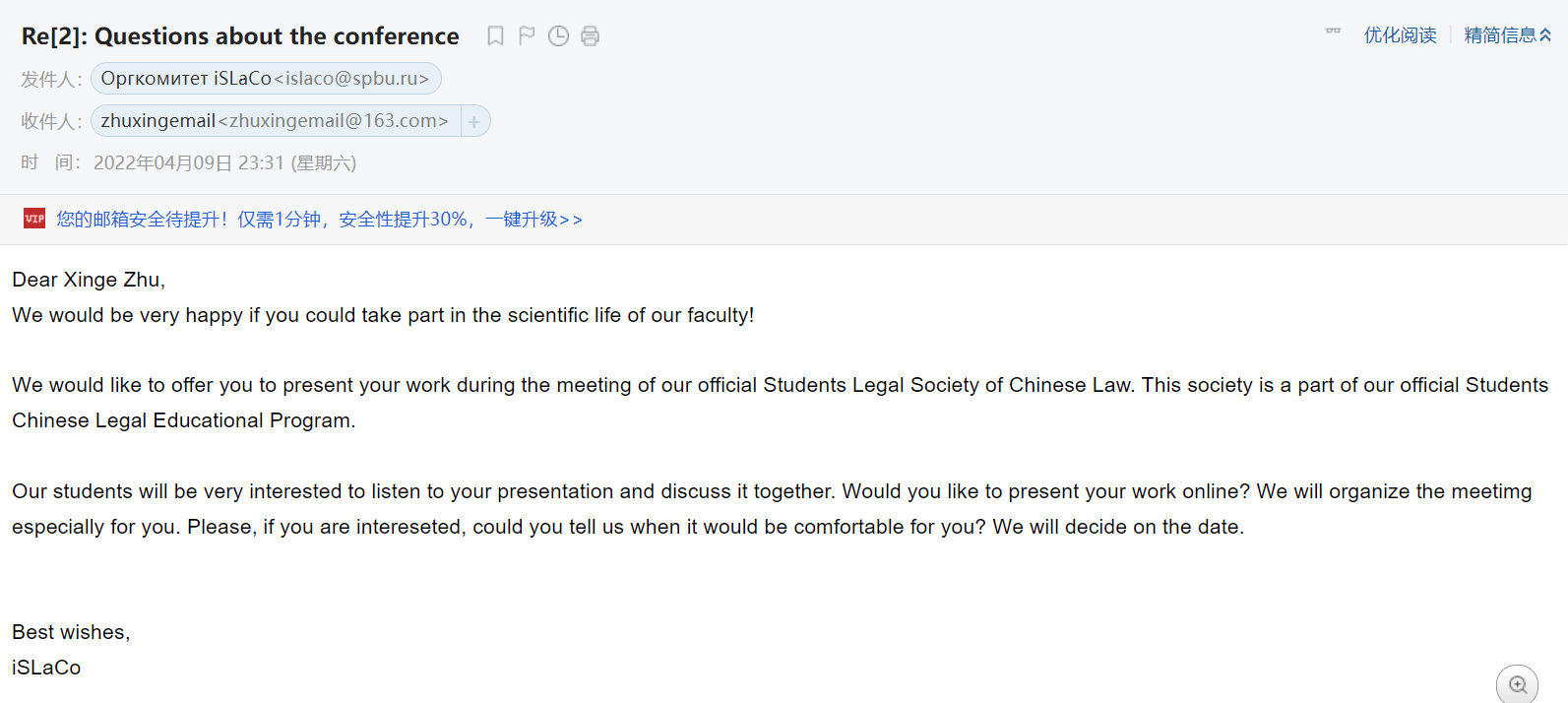学生在会议上的精彩学术报告,给圣彼得堡国立大学的师生以及其他各国的参会学生留下了深刻的印象。会议结束后,朱欣格同学收到圣彼得堡国立大学的邮件,邀请她继续参与圣彼得堡国立大学快猫