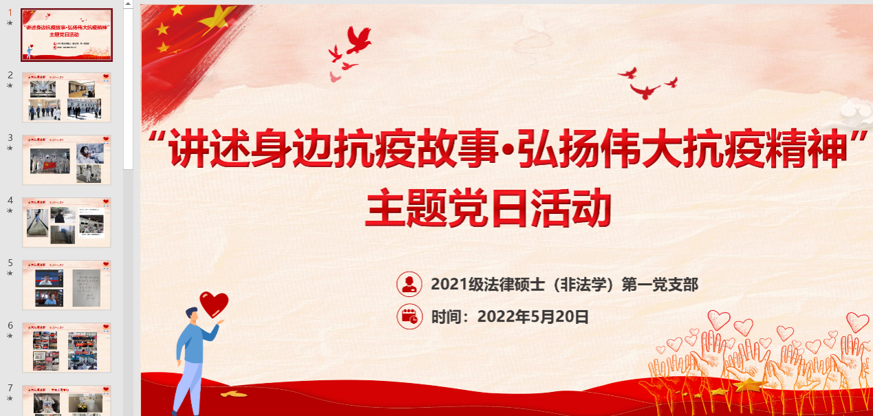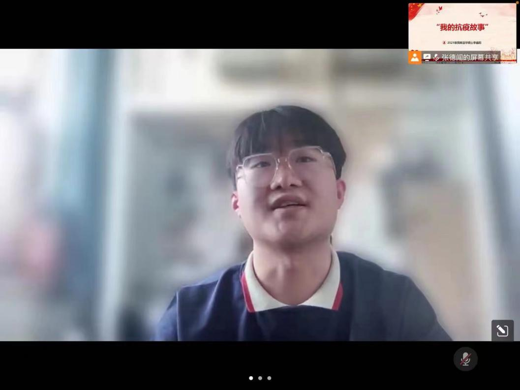 委员会关于新冠疫情应急管控时期加强党的建设的指导意见》有关要求,为进一步弘扬伟大抗疫精神,大力宣传身边党员和师生在疫情防控中的先进事迹、感人故事与崇高精神,2021级法律硕士(非法学)第一党支部全体党员在5月20日召开以“讲述身边抗疫故事,弘扬伟大抗疫精神”为主题的线上党日活动。为使党员同志们能够身临其境地感受志愿者们的伟大付出,本次党日活动邀请了崔馨予、李鑫阳、朱叶儿三名曾担任疫情防控志愿者的同学为大家讲述担任志愿者时的工作与感想。