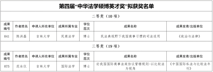 博士研究生陈洪磊的研究成果《民法典视野下我国商事习惯的司法适用》拟获二等奖,博士研究生范冰仪的研究成果《论我国国际商事法庭协议管辖规则-以比较法为视角》拟获三等奖。以上两份获奖成果,是快猫