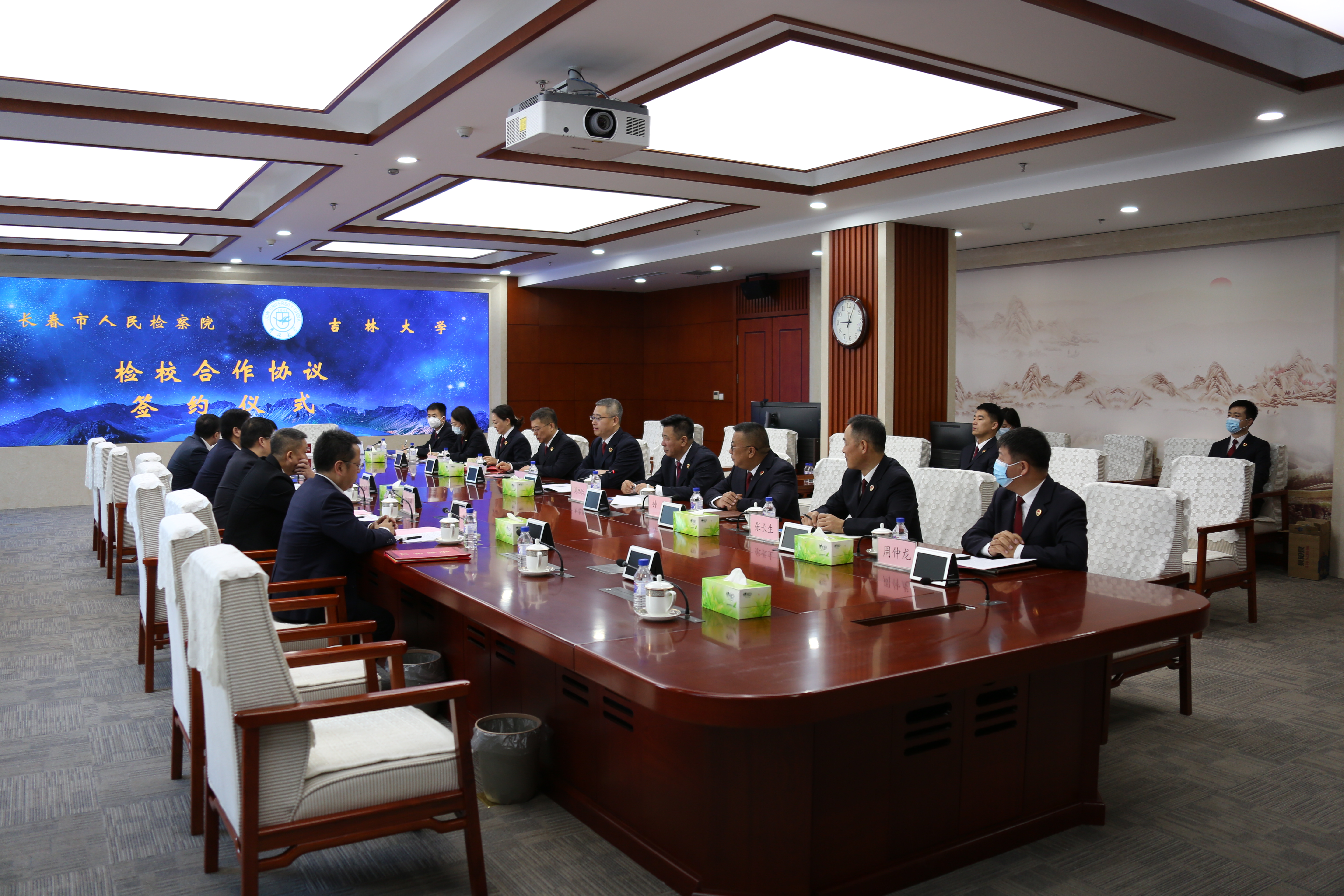 党委书记周春国、院长何志鹏、副书记张俊峰、副院长吕欣、副院长曹险峰出席了签约仪式,并与长春市检察院党组书记、检察长李军等检察院领导进行了座谈交流。签约仪式由长春市检察院党组副书记、常务副检察长刘志民主持。