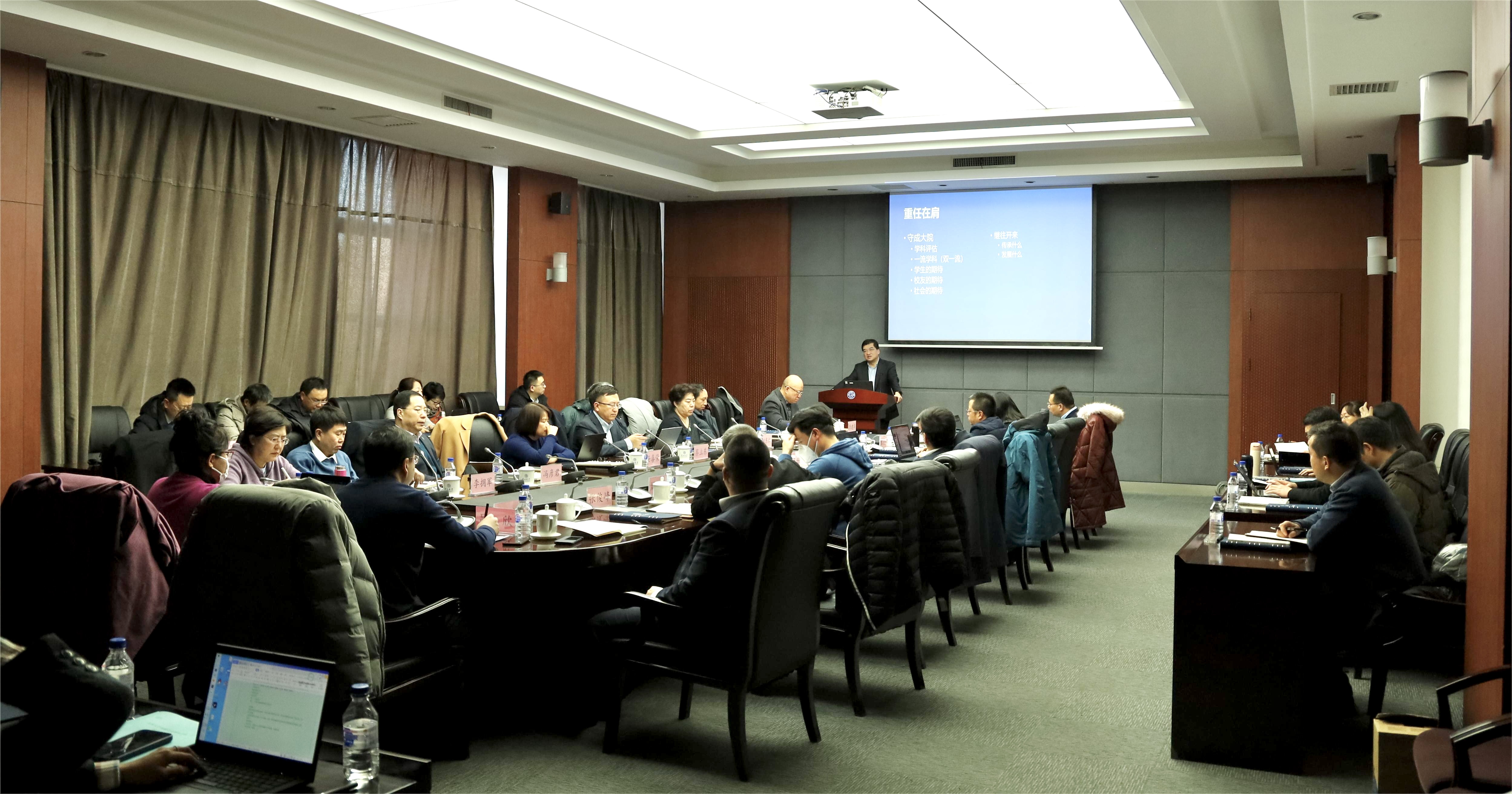 的学科建设、科学研究、人才培养、师资队伍、服务社会、国际交流等领域的工作提升提出中肯意见。第一,和是核心竞争力,学科发展重要的是要有一个向上的势能,要深刻认识并充分激发起教师的动力,通过深入调研,了解实际情况,完善相应机制建设,推动教师迸发科研势能,同时,持续建设院内以教学和科研为主导的文化氛围,积极开展学术交流活动,推进教师走出去引进来,在拓宽学术视野的过程中准确找到学术方向,加紧师资队伍建设。第二,要瞄准国家重大战略需求,准确了解和把握国家对学科建设的导向与方向,找准定位谋划发展,认真解读学校相关政策,及时对院内工作作出安排部署。要增强科研和教学的方向感,提升科研的资政服务能力水平,注重本科教学项目创新性设计,强化学科的自主知识体系建设。第三,要加强目标落实的路径和动力机制建设,推进工作的项目化管理,实现以“任务清单化、操作手册化、运行规范化、工作指标化、业务数字化”为主要内容的“五化”工作法,提升管理服务工作水平。