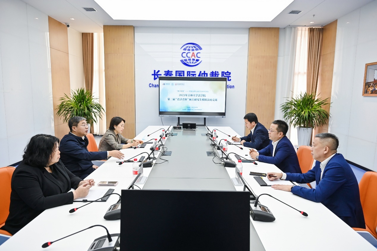 会后,本届模拟法庭决赛在长春智慧法务区报告厅正式打响,决赛由吉林省高级人民法院宋国法官、君泽君律师事务所高级合伙人曲海君律师和胡晓静教授组成合议庭。长春智慧法务区王佳副主任、产业规划科孙珮英科长,长春市司法局律师管理处王晓波处长,君泽君律师事务所包晓莲主任、执行主任任家震律师、谭琳琳律师、程明伦律师、郭健律师、刁怀禹律师,快猫