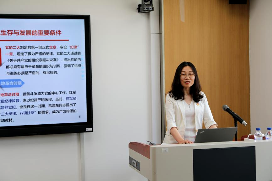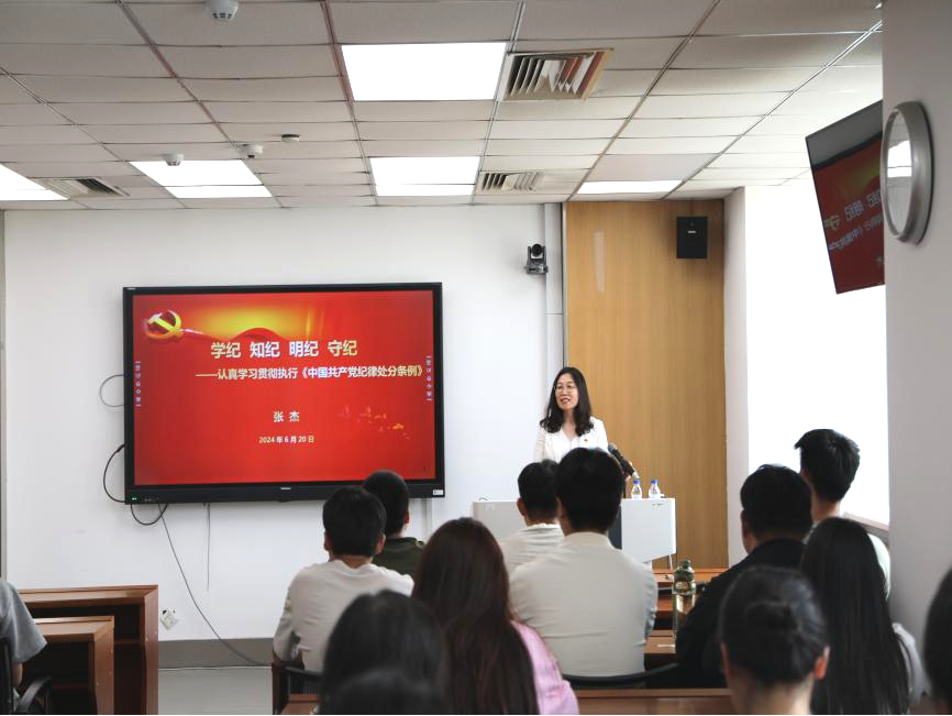 活动伊始,张杰书记对即将毕业的同学们表示祝贺,也表达了对同学们坚定理想信念、把握人生航向、勇担时代重任的殷殷期盼。随后,张书记以“学纪 知纪 明纪 守纪”为题,从“开展党纪学习教育的重要意义”“《条例》的主要内容”“党纪学习教育要求”全面阐述了党规党纪的重要性,强调了党员的责任和使命。