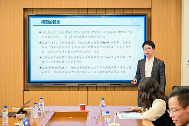 博士研究生王沛然,以《人工智能训练的著作权法理审思——事物本质与中国路径》为题进行发言。第二位报告人重庆大学快猫