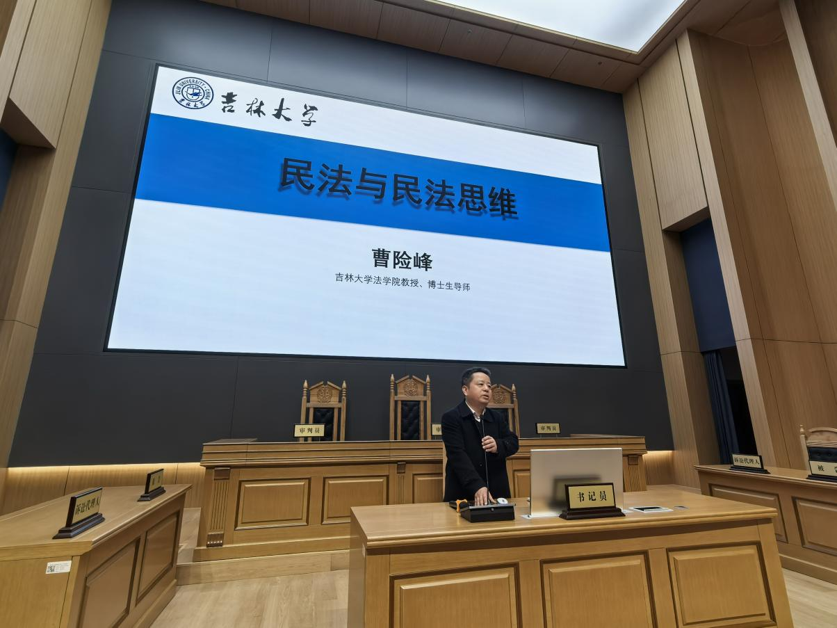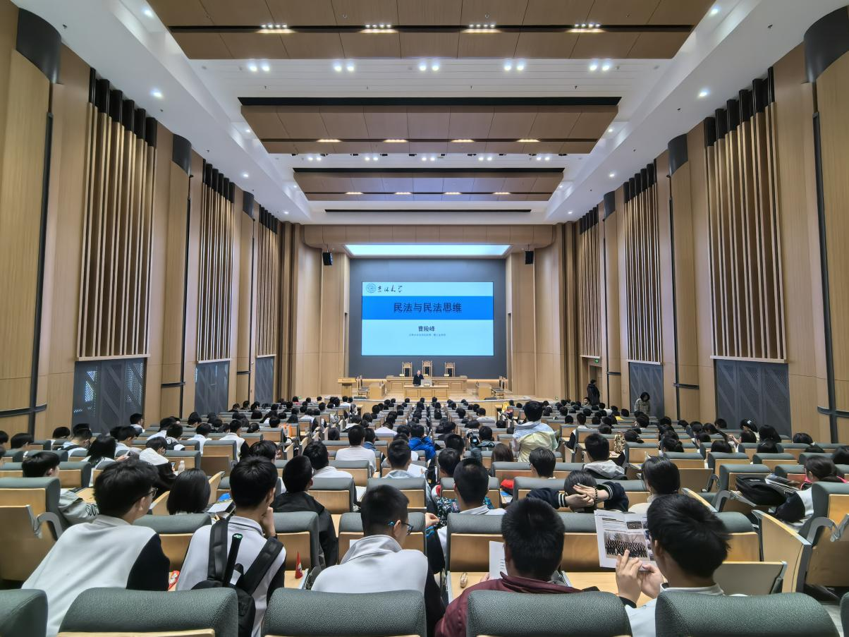 法学楼门前集合,在学生志愿者和带队老师的带领下参观了B101模拟法庭报告厅。在庄重宏伟的模拟法庭中,由曹险峰教授为同学们讲授了一堂以“民法与民法思维”为主题的讲座。曹教授以生动案例解析热点法律问题,深入浅出的讲解让晦涩的理论变得鲜活,尤其是流浪猫纠纷案的讲解让同学们重新审视责任、道德和法律的边界,逐渐理解法律判断并非非黑即白,法律不仅是冰冷的条文,更是守护社会秩序的规则基石。同学们对于高度还原法庭真实场景的教室倍感新奇,身临其境式的学习体验更加激发了同学们对快猫