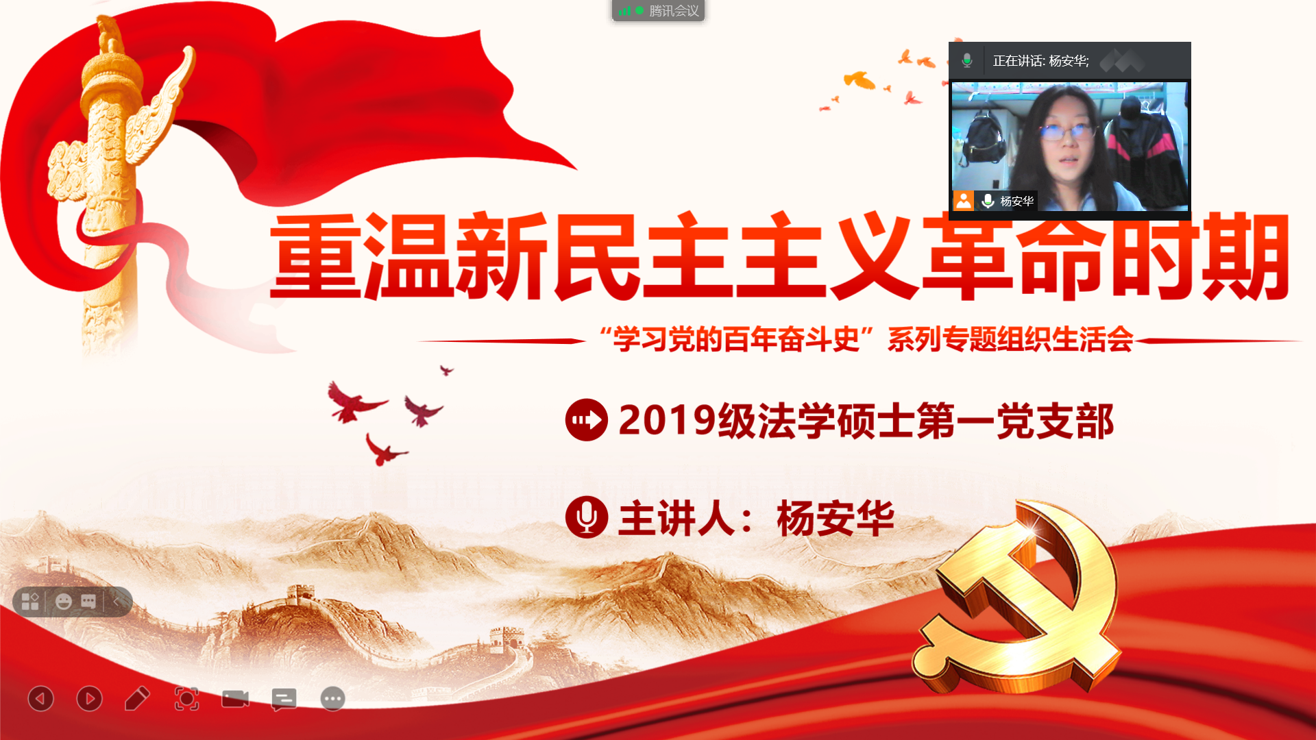 2019级法学硕士第一党支部开展了“学习党的百年奋斗史”系列专题组织生活会之重温新民主主义革命时期历史。此次会议以线上视频的方式举行,由第一党支部书记杨安华主持,出席会议12人,请假1人。