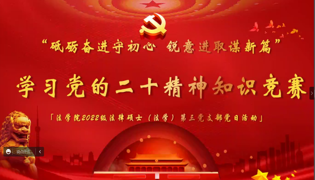 2022级法律硕士(法学)第三党支部于2022年11月25日开展党的二十大精神知识竞赛。本次知识竞赛由党支部书记佟秋颐主持,全体党员和部分入党申请人参加本次知识竞赛。