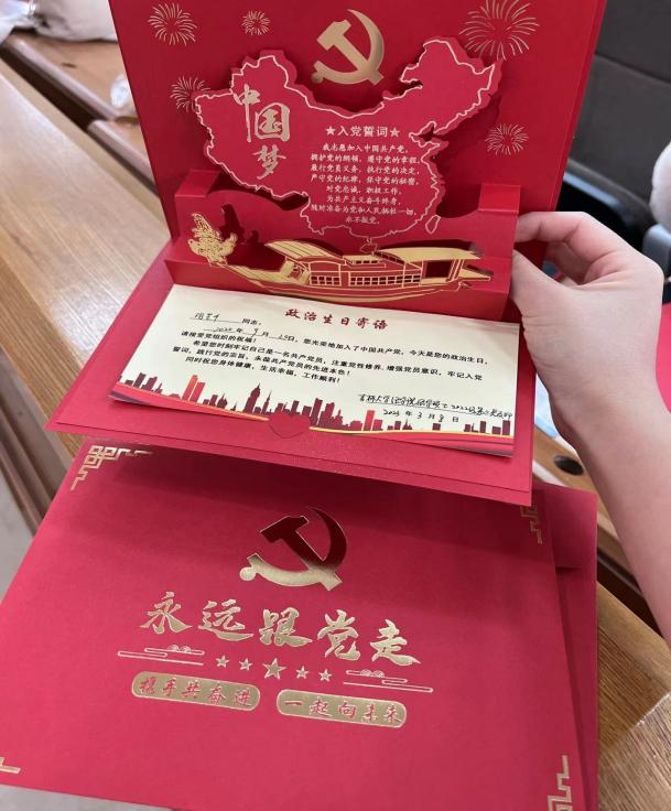 政治生日话初心,团结奋斗勇向前。为增强党日活动“仪式感”和“新鲜感”,支部全体党员在支部书记的组织下一同过了自己的政治生日。“政治生日”是指党员的入党日,是一项严肃的组织生活。中央办公厅印发的《关于巩固深化“不忘初心、牢记使命”主题教育成果的意见》中提出,强化对党忠诚教育,落实主题党日制度,坚持和完善重温入党誓词、党员过“政治生日”等政治仪式,教育引导党员、干部强化党的意识、党员意识。支部书记王珂馨为每位党员送上了贺卡和精美礼物。同时,支部全体党员也共同回忆了自己的入党初心与入党历程,这有利于每位党员不忘初心,继续努力,时刻牢记党的嘱托和自己的光荣使命,永葆共产党员的先进本色。