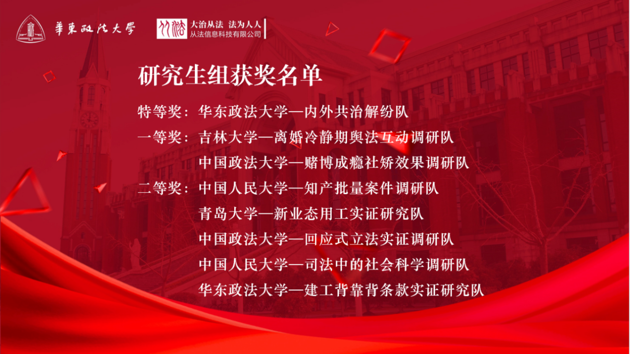 由李晓倩教授担任指导教师,2021级诉讼法学硕士研究生张雅倩担任队长,2021级诉讼法学硕士研究生于新雅、2022级诉讼法学硕士研究生曹莺、2021级本科生贺雯雯、2021级本科生王宁、2021级本科生郝星宇担任队员的“离婚冷静期舆法互动调研队”荣获研究生组一等奖!