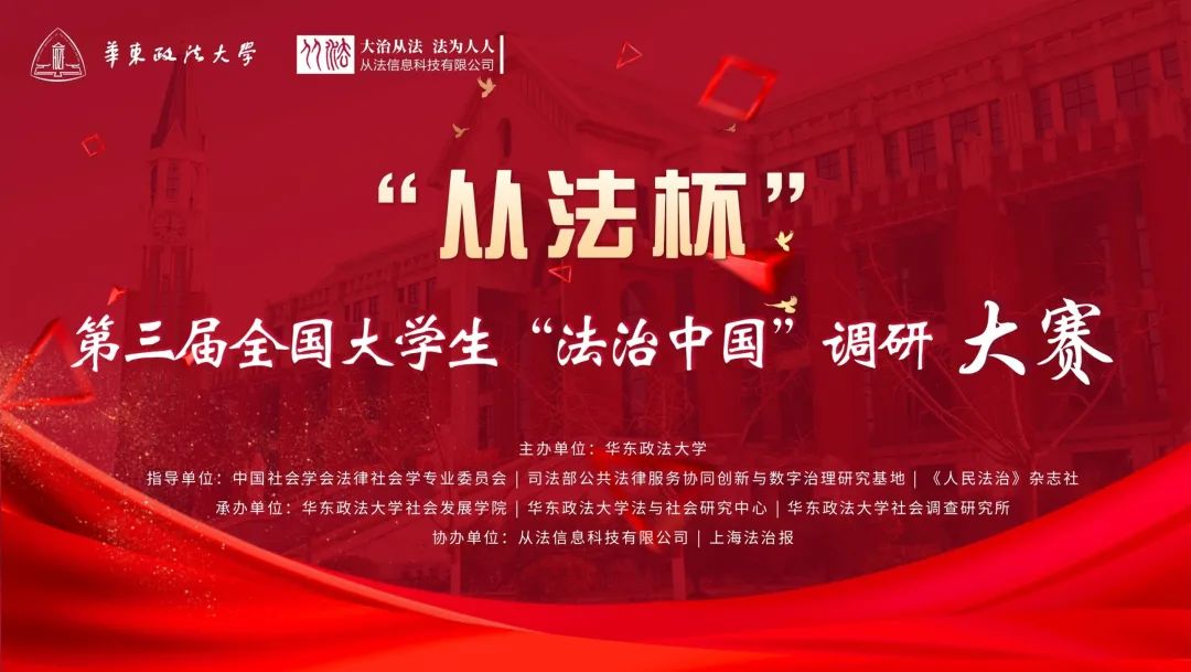 2023年10月28日,第三届“从法杯”全国大学生“法治中国”调研大赛总决赛在上海圆满落幕。该项赛事由华东政法大学主办,指导单位为中国社会学会法律社会学专业委员会、司法部公共法律服务协同创新与数字治理研究基地、《人民法治》杂志社,华东政法大学社会发展学院、华东政法大学社会调查研究所承办,从法信息科技有限公司、上海法治报协办,旨在为关注中国法治发展的大学生提供相互交流、共同进步的平台。