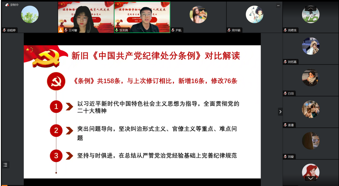 内化党纪于心,笃行奋进力量。2022级法学硕士第三党支部书记王珂馨、第一党支部纪检委员赵文慧结合《中国共产党纪律处分条例》的具体条文内容,从以案说德、以案说纪、以案说责等三个方面展开选取典型案例并进行分析。一桩桩生动的案例,一个个违纪者的现身说法,从实例出发深化感悟体会,使得全体党员和积极分子深深感受到守住底线、不碰红线、遵纪守法的重要性和必要性。