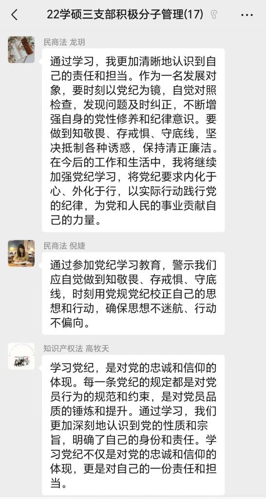 时时深学细悟,处处自省自警。各支部组织全体党员和积极分子撰写学习心得体会,以群内发言的形式进行反馈。以反思叩问初心,以实践彰显担当,用“清醒的认知”涵养“遵纪守规”自觉,铺就“清澈的底色”,自觉投身社会主义法治建设之中。