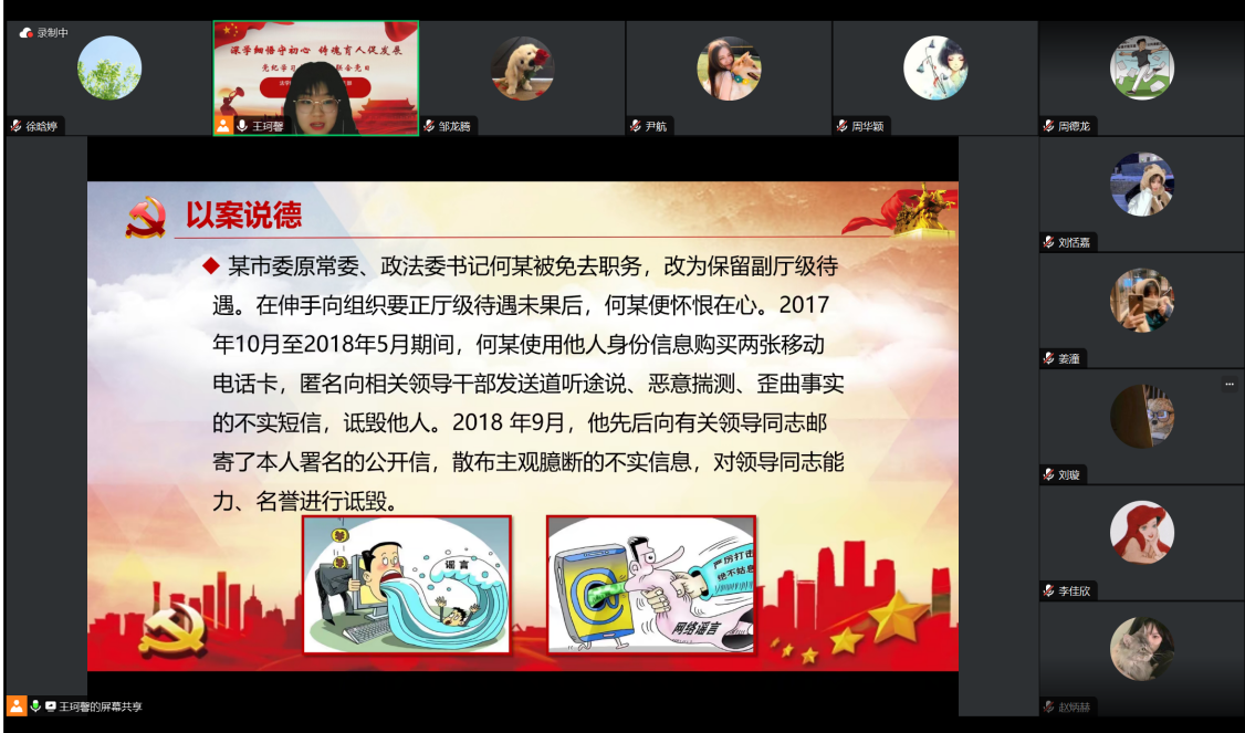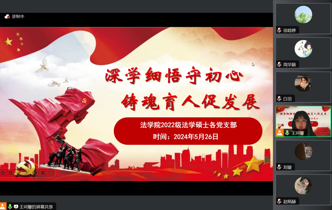 2022级法学硕士各党支部于5月26日举办“深学细悟守初心 铸魂育人促发展”联合线上党日活动,旨在引导全体党员和积极分子学出更加坚定的政治忠诚,学出更加自觉的纪律意识,学出更加过硬的能力作风,学出更加强烈的责任担当。本次活动由2022级法学硕士第三党支部书记王珂馨主持。