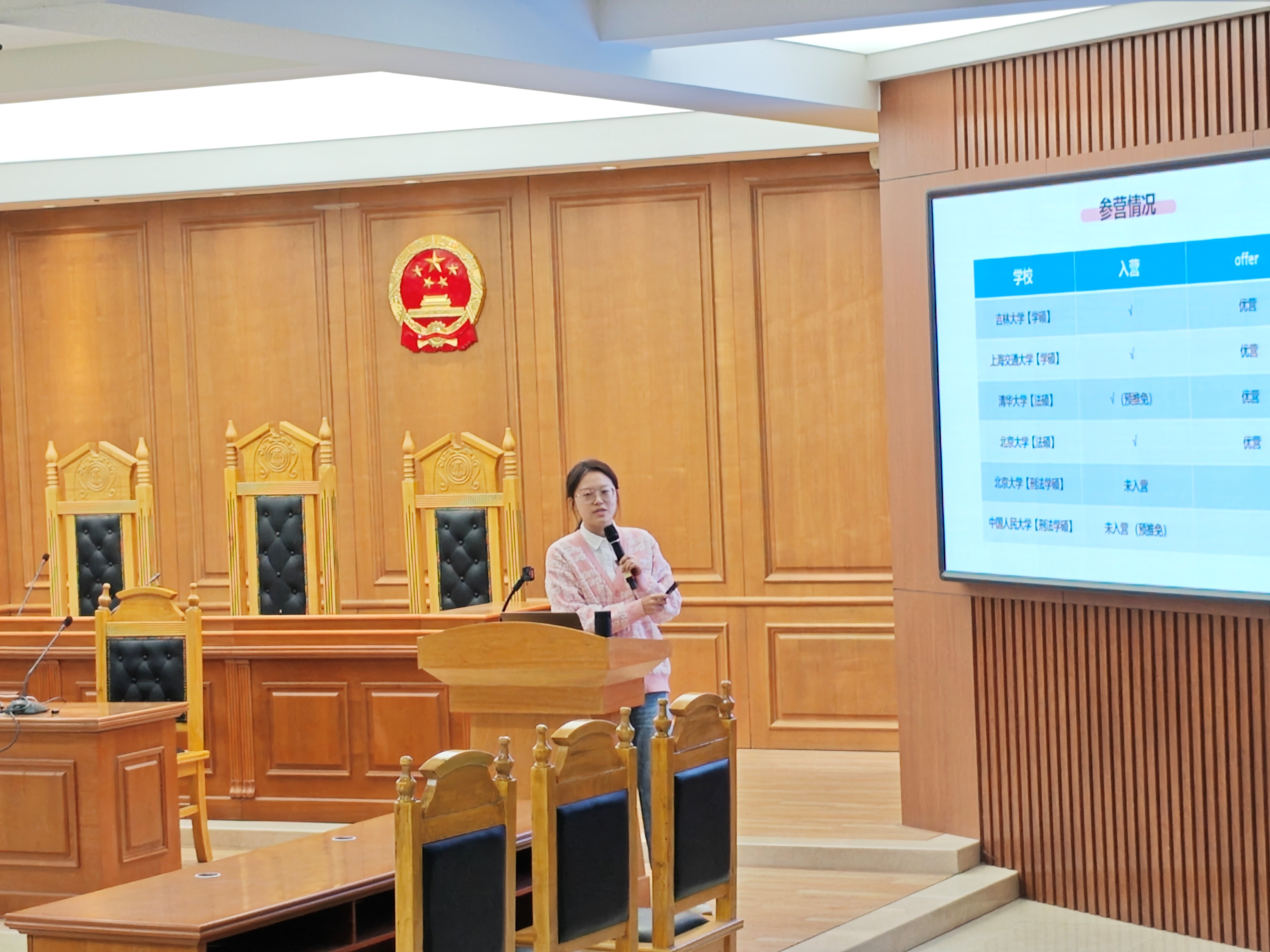 汤瑷玮同学以“纵有万钧之势,亦应震荡于一”为主题,她认为人要学会给自己造势,再落于一点。她从保研的相关概念入手,向学生们介绍了如何在准备过程中提升自己的个人优势,强调学业成绩重要性,建议大家找好学硕方向,打好法硕基础,机动改变方向,做到凡事有计划,凡事不要慌,鼓励学生们天无绝人之路,要学会置之死地而后生。