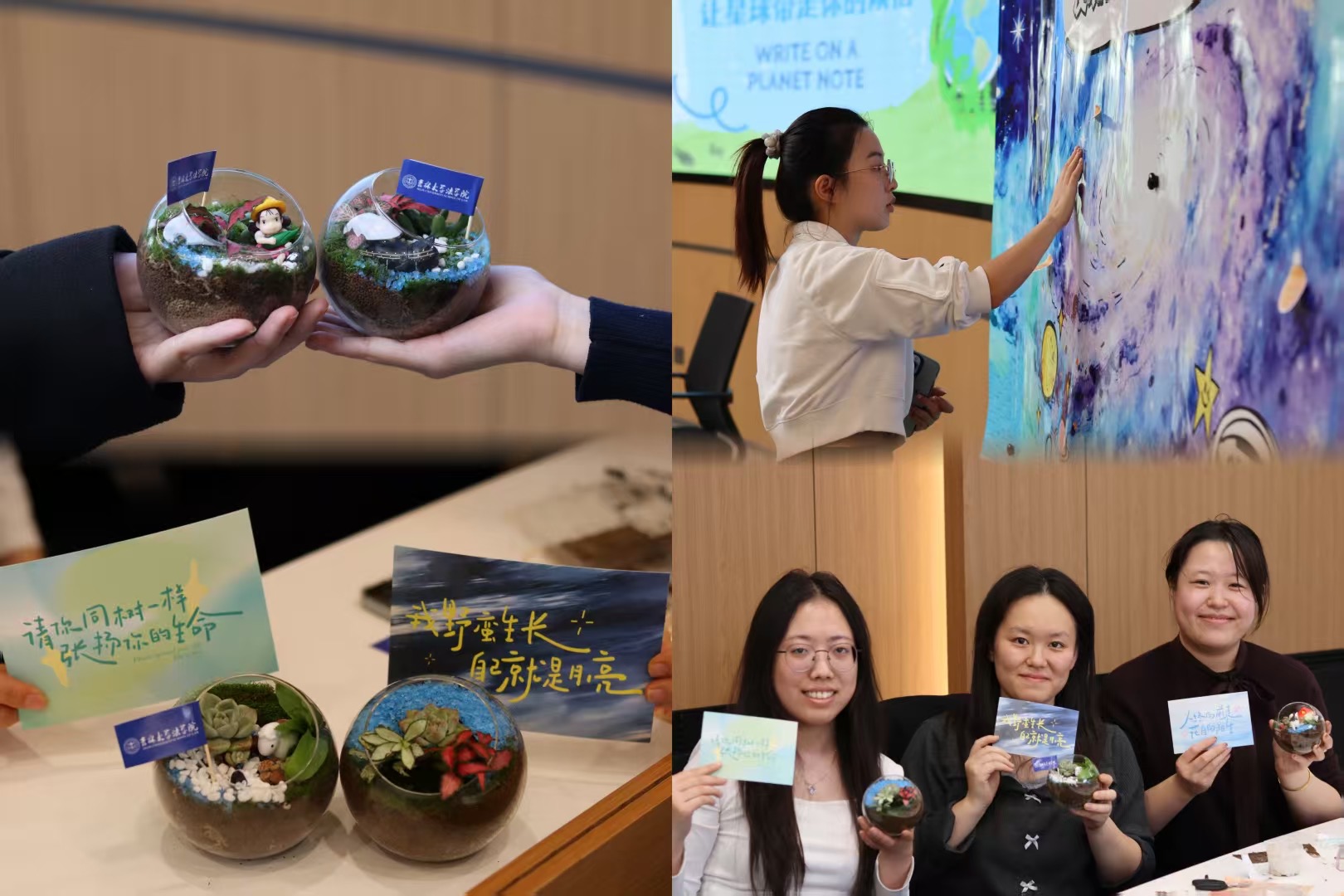 活动伊始,主持人详细介绍本次活动的主要流程,工作人员分发“情绪书写卡”,同学们匿名写下烦恼后投入到情绪盲盒中。接下来主持人简要介绍植物微景观的含义以及制作方法,并为同学们演示制作的基本步骤,讲解制作技巧和注意事项。活动现场,法律硕士联合会为同学们准备了多样齐全的原材料与种类丰富的植物、微缩摆件,一个个与众不同的植物微景观被同学们创造出来,大家把注意力从生活上转移到掌中森林,为冬日增加一抹生机,现场气氛温馨治愈。活动进入尾声,同学们在心情盲盒里随机抽出烦恼卡片,并在明信片上写下自己的回应。一个个牛皮纸袋中,都装满了来自陌生人的鼓励与祝福,空气中流动着温暖与幸福。同学们将星球样式的便签纸贴到“银河新星系”的海报上,写满了对自己未来的期盼。