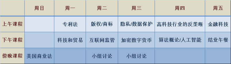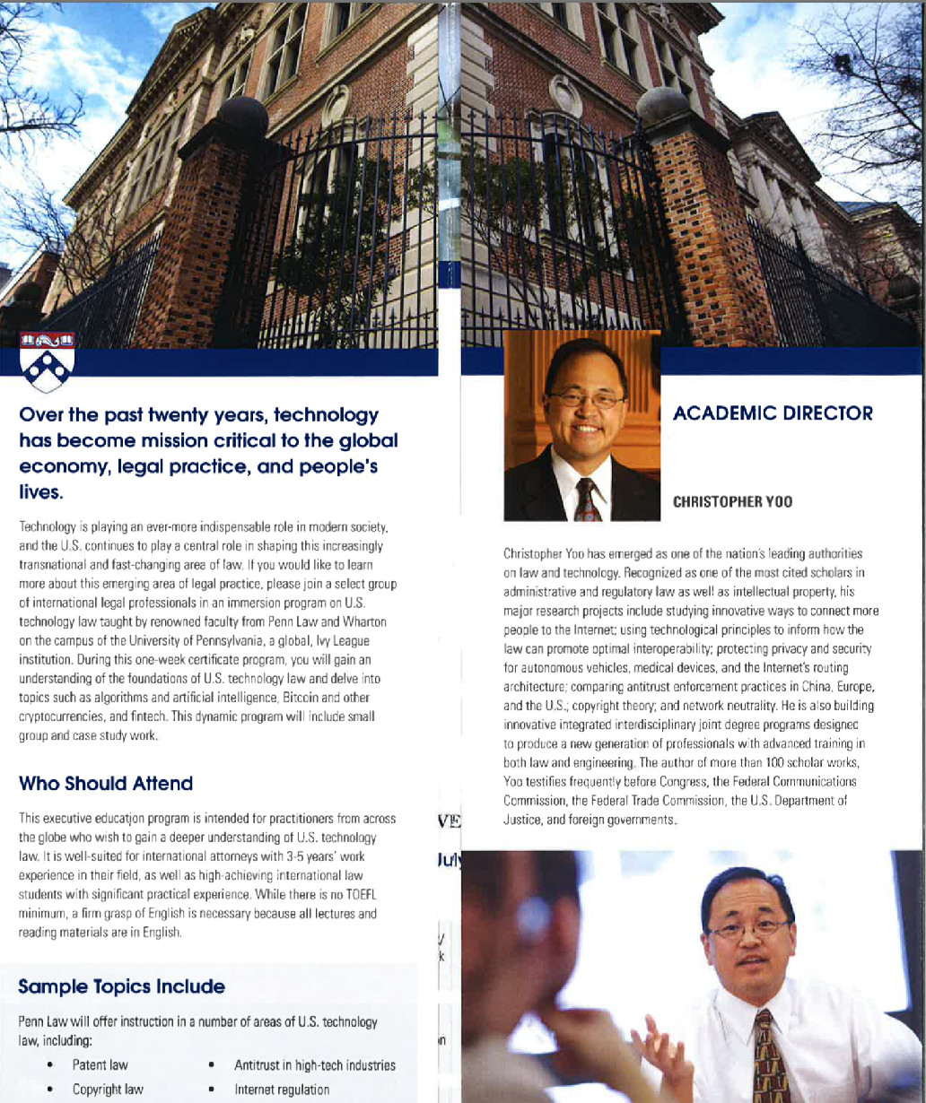 暑期美国法律与科技证书,为期一周。这个课程将使与会者理解美国科技法律的基础原理 — 专利法、著作权法、反垄断在高科技产业,互联网监管,隐私和数据保护的应用,并深入研究的话题,例如算法和人工智能,比特币和其他加密数字货币,以及金融科技。该课程由宾夕法尼亚大学快猫