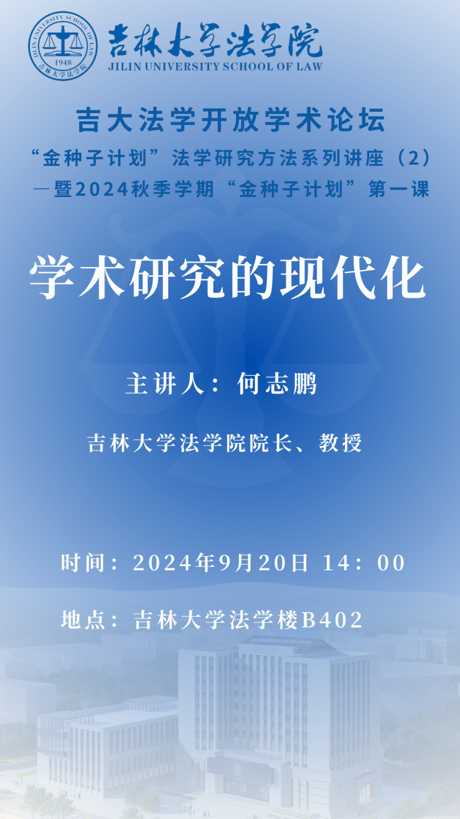 自2021年9月快猫 启动“金种子计划”以来,为培养具有扎实理论功底、自主创新意识和广阔前沿视野的法学人才,“金种子计划”已开展法学与交叉学科系列讲座、法学研究方法系列讲座和法学学术论文写作系列讲座。本期将由快猫 院长何志鹏教授为成员们作《学术研究的现代化》专题讲座。