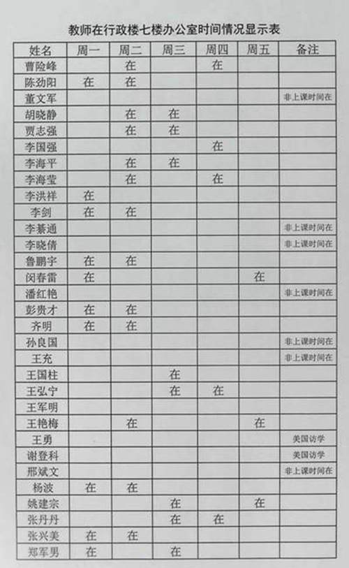目前,有31名教师搬迁到行政楼七楼办公室工作,为方便教师教学科研和彼此联络,现将教师每周在办公室时间进行公布,如果有变化,请联系院办更改。
