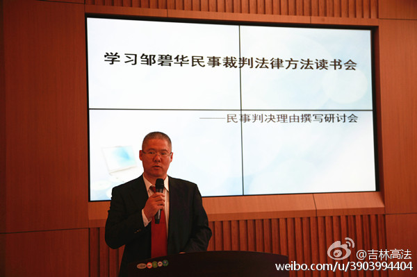 下午继续进行的是法律适用方法实务研讨,主题发言人均是省内各法院一线的法官们。吉林省高院民一庭副庭长姜涛法官首先发言。他提出在一定地域范围内法律职业者应当形成一个职业共同体,因而邹碧华法官的法律适用方法不应当仅仅适用于法官的司法裁判过程,检察官、律师乃至快猫