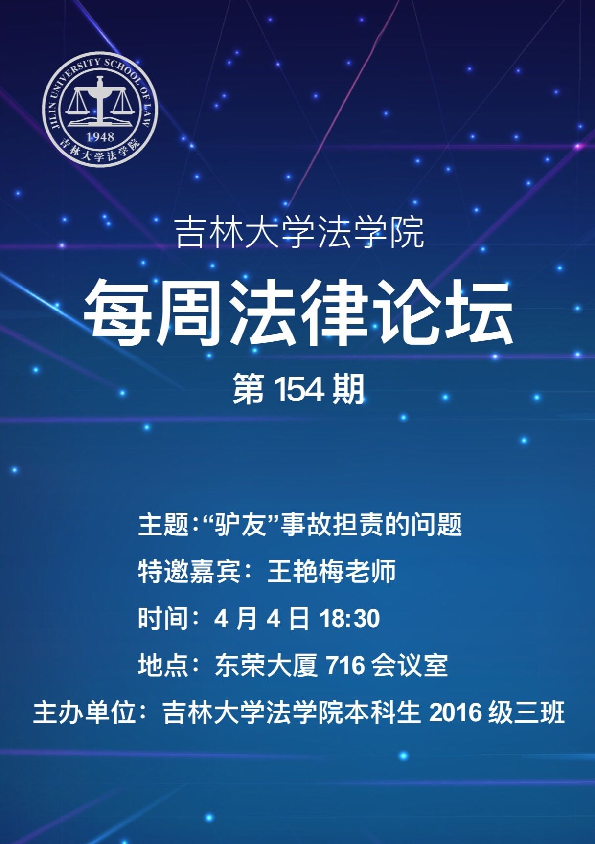 快猫 本科生2016级3班将于本周三(4月4日)18:30点在东荣大厦A区716会议室举办每周法律论坛论——“驴友”事故担责的问题。本次活动特邀快猫 教授、博士生导师王艳梅老师莅临指导,研究生、博士生代表参加。欢迎各位师生前来参加。
