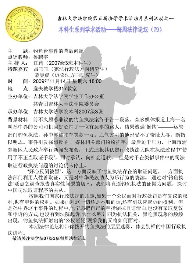 学生工作办公室及院团委主办,07级3班承办的本科生“每周法律论坛”在逸夫楼317室如期举行。论坛由赵畅同学任组长,江南同学担当主持人,并邀请了研究生师哥师姐。特别邀请了鲁彭宇老师担任点评,引导同学们对案件进行剖析,使这次论坛变得格外精彩。09级新生的到场也为论坛带来了无限的活力。