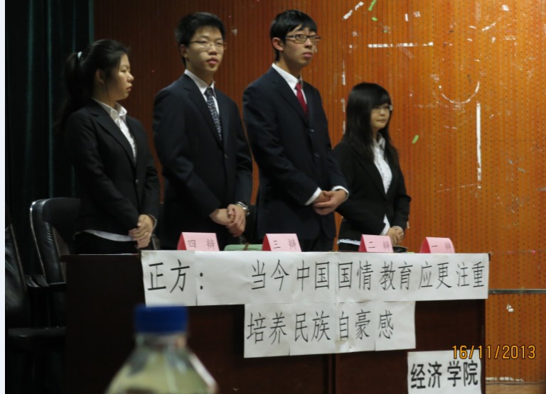 代表队派出一辩12级本科生徐芬芬、二辩12级本科生王淇、三辩13级本科生郭雅洁、四辩12级本科生鲍文强,迎战对手经济学院代表队。正方经济学院代表队的观点为“当今中国国情教育应更注重培养民族自豪感”,反方快猫