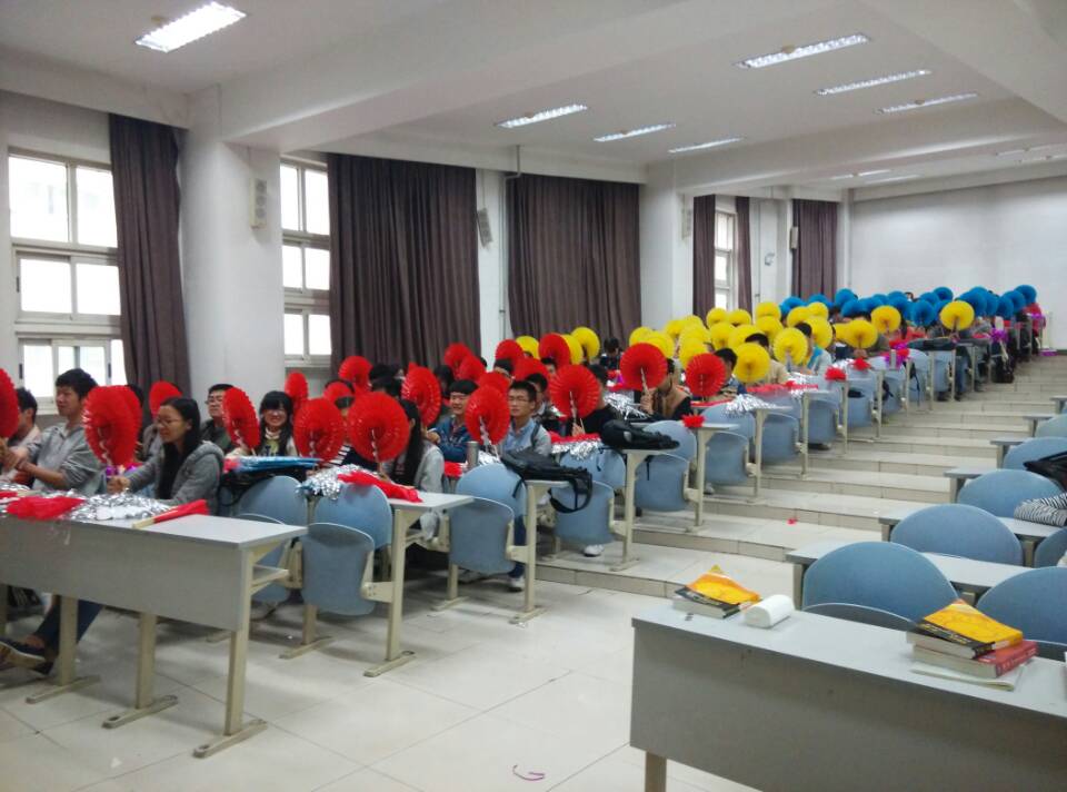 由于天气原因,原定于田径场看台实地彩排的观众团排练不得不转移到三教八阶进行。5月14日上午,生管会工作人员带领着由2013级108名同学组成的快猫