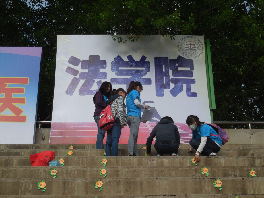早晨6点左右,生管会工作人员已经投入到一天的忙碌工作中。女生们在看台上贴座签、摆放坐垫和手摇花等道具,男生去搬运大鼓、扩音器、饮用水等大型备品。同时为了防止观众出现中暑等突发症状,生管会贴心的准备了“金嗓子喉片”、“藿香正气水”等药品。其中,本次观众团的每一个座签都是由工作人员纯手工制作,创意性地剪成了“法”字形状的“向日葵”,并涂染成阳光般的金黄色,既展现了快猫