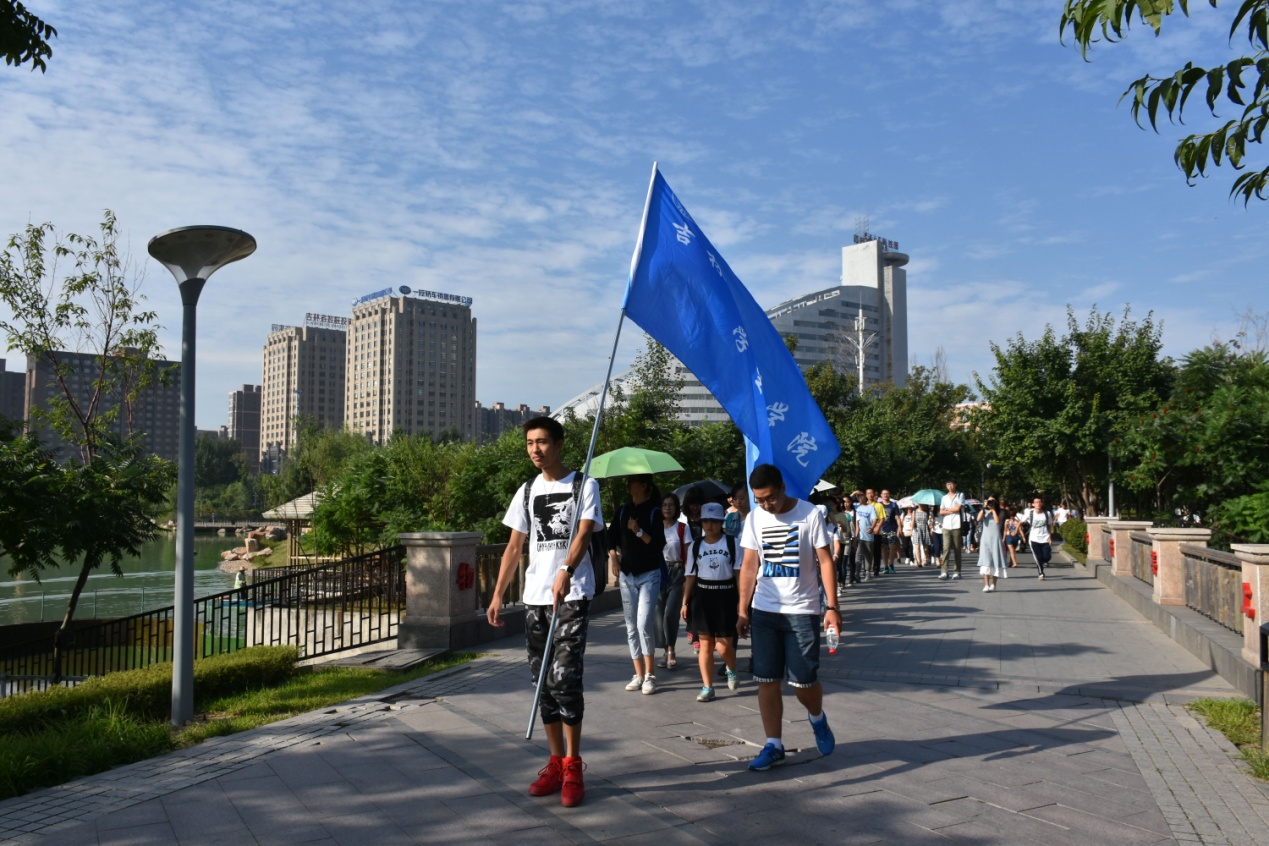 新生在大学城宿舍楼下集合,开始集体游校园。