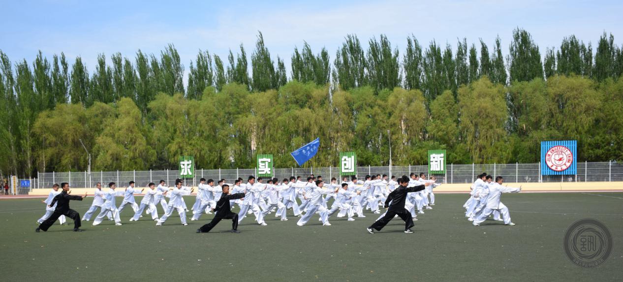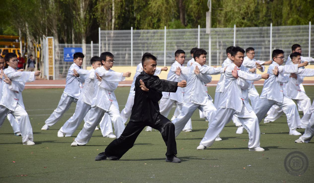 的院旗随风飘扬,队员们做出标准而整齐划一的动作,或出拳,或抬腿,或深蹲,或起跳……经过将近一个月的艰苦训练,每一式的动作队员们都烂熟于心。音乐结束,队员们又迅速地聚拢,恢复入场时的队形,跑步退场。