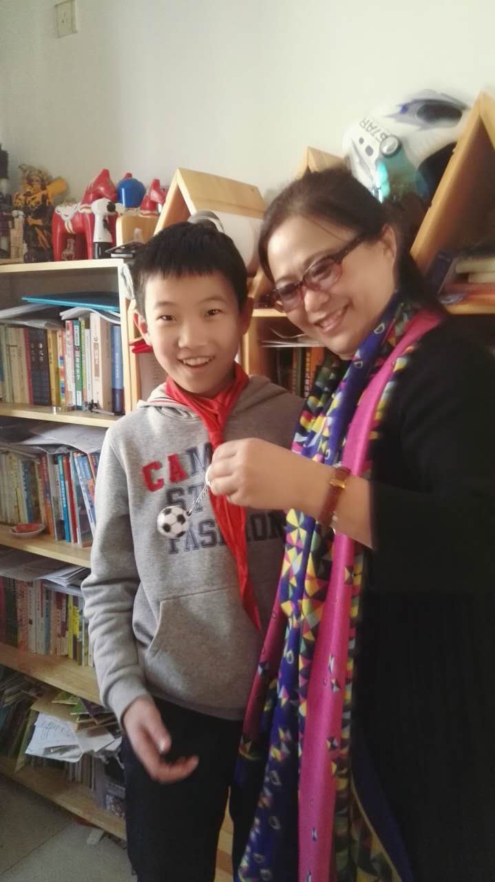 李程把自己亲手制作的足球钥匙链作为礼物送给我留念