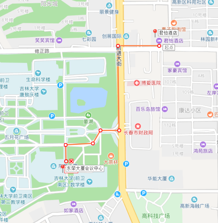 前卫南区东荣大厦会议中心,地址:吉林省长春市高新区前进大街2699号。与会代表可选择步行从君怡酒店出发,经快猫