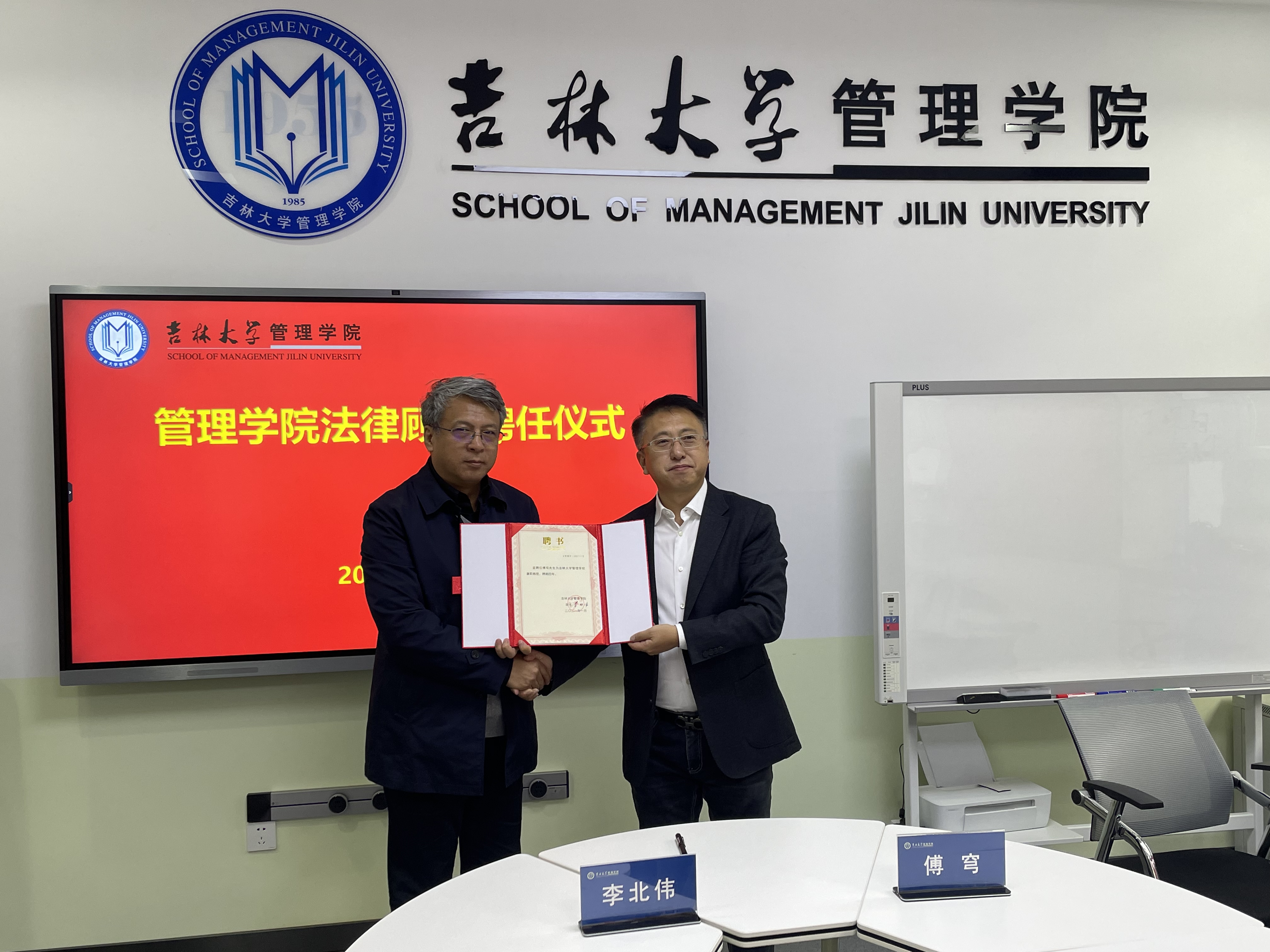 管理学院党委书记赵军、副院长樊雪梅、马捷、马腾参加了聘任仪式,聘任仪式由院长李北伟教授主持。李北伟院长与傅穹教授签订了法律顾问聘任合同,赵军书记、李北伟院长分别为傅穹教授颁发法律顾问聘书、兼职教授聘书。