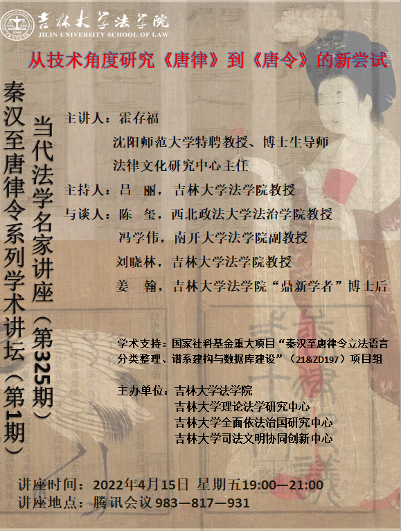 第325期“当代法学名家讲座”暨“秦汉至唐律令系列学术讲坛”第一讲,讲座题目为“从技术角度研究《唐律》到《唐令》的新尝试”。系列讲座是国家社科基金重大项目“秦汉至唐律令立法语言分类整理、谱系建构与数据库建设”(21&ZD197)项目推进的重要平台。本次讲座由快猫