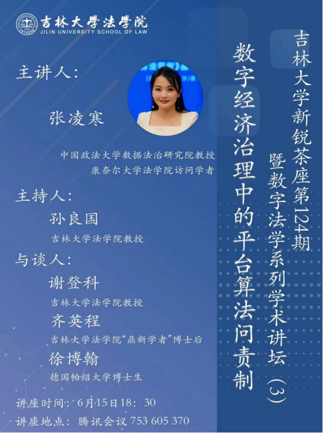 第124期新锐茶座暨第3期数字法学系列学术讲坛,讲座主题为“数字经济治理中的平台算法问责制”。本次讲座由快猫