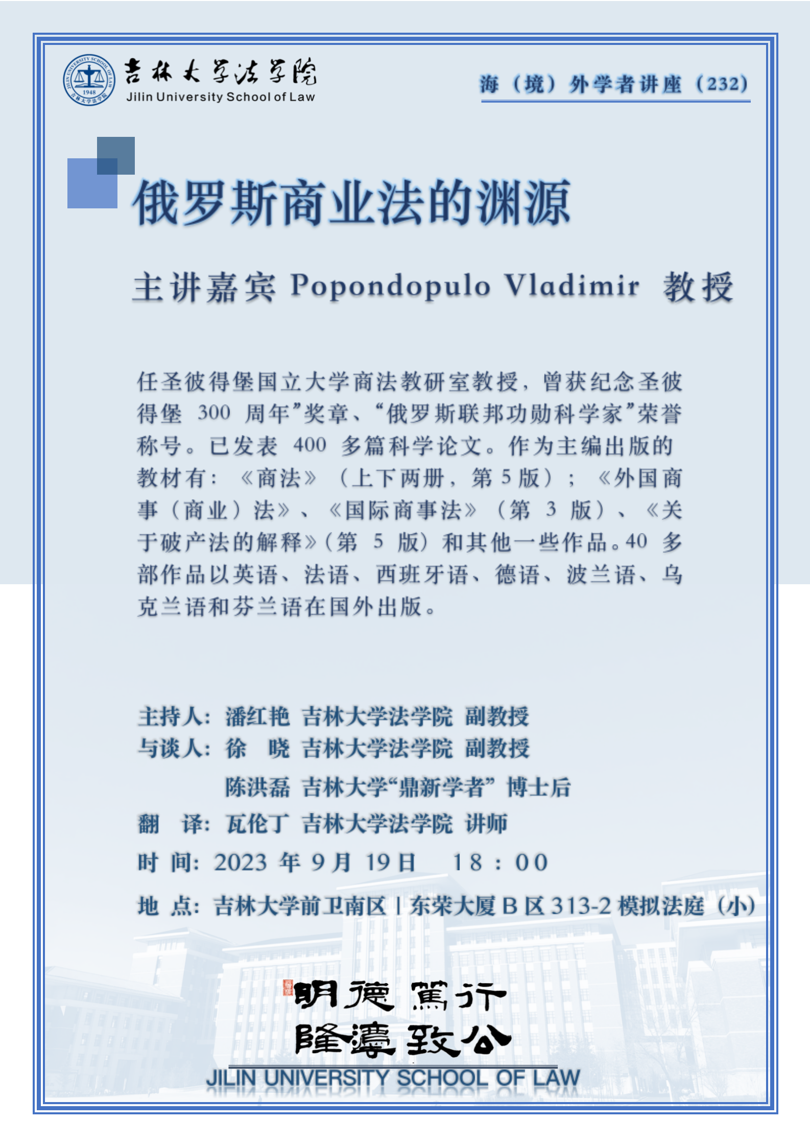 经历:任圣彼得堡国立大学商法教研室教授,曾获纪念圣彼得堡 300 周年”奖章、“俄罗斯联邦功勋科学家”荣誉称号。已发表 400 多篇科学论文。作为主编出版的教材有:《商法》(上下两册,第5版);《外国商事(商业)法》、《国际商事法》(第 3 版)、《关于破产法的解释》(第 5 版) 和其他一些作品。40 多部作品以英语、法语、西班牙语、德语、波兰语、乌克兰语和芬兰语在国外出版。