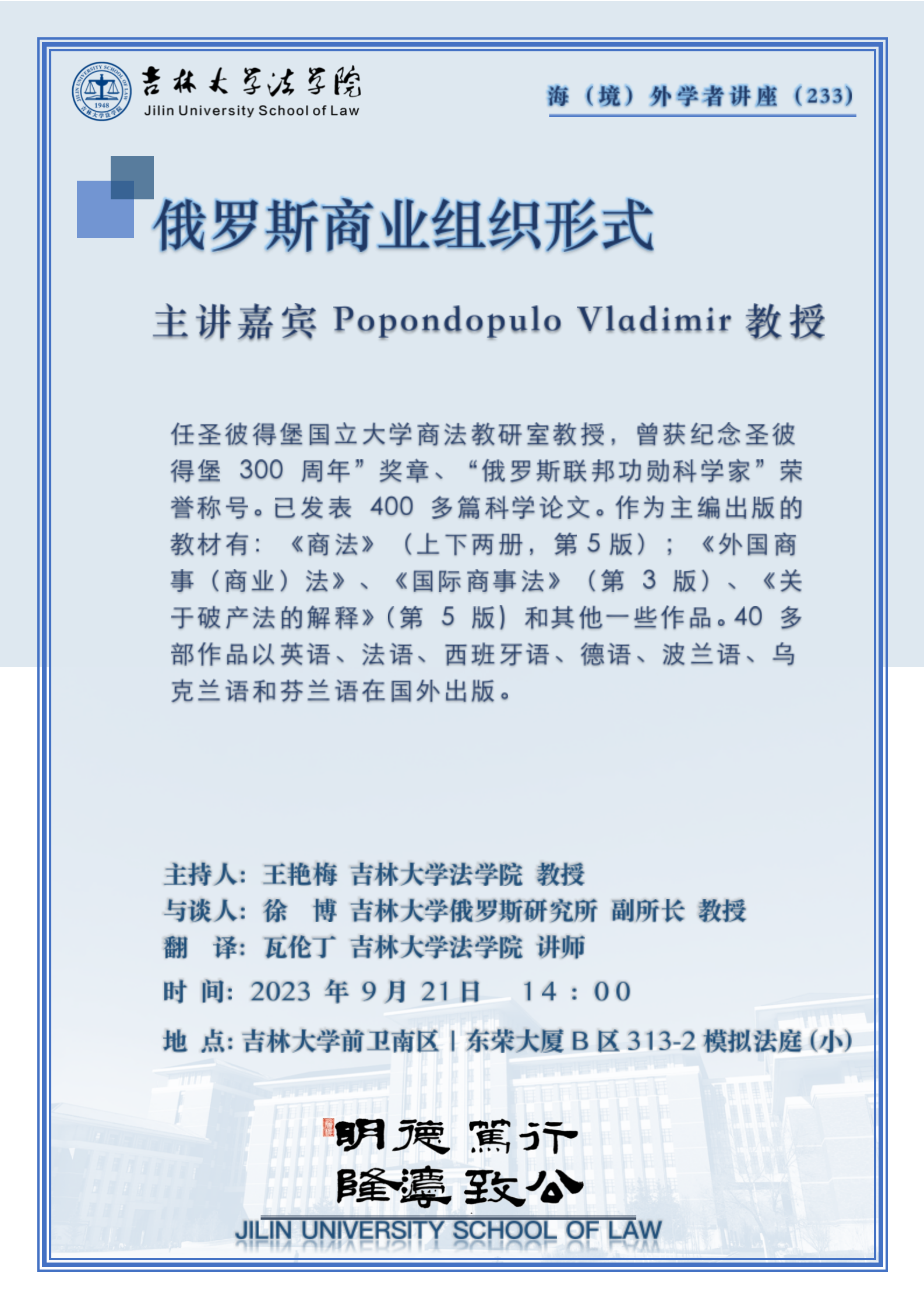 经历:任圣彼得堡国立大学商法教研室教授,曾获纪念圣彼得堡 300 周年”奖章、“俄罗斯联邦功勋科学家”荣誉称号。已发表 400 多篇科学论文。作为主编出版的教材有:《商法》(上下两册,第5版);《外国商事(商业)法》、《国际商事法》(第 3 版)、《关于破产法的解释》(第 5 版) 和其他一些作品。40 多部作品以英语、法语、西班牙语、德语、波兰语、乌克兰语和芬兰语在国外出版。