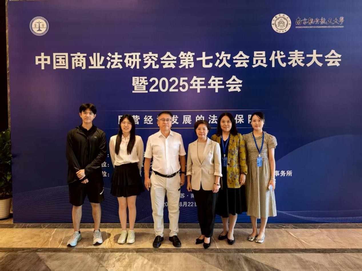 于莹教授、傅穹教授、王艳梅教授、胡晓静教授,以及四位博士研究生徐艺瑄、吴雨泽、孙永敏、于欣鹭,一位硕士研究生刘佳源,前往江苏省南京市参加中国商业法研究会第七次会员代表大会暨2025年年会,共同参与、探讨关于“民营经济发展的法治保障”主题的最新理论与实务问题。本次论坛由中国商业法研究会主办,南京航空航天大学人文与社会科学学院承办。来自立法机关、审判机关、检察机关、群团组织、律师事务所等单位和高校科研院所的300余名代表参加了本次年会。