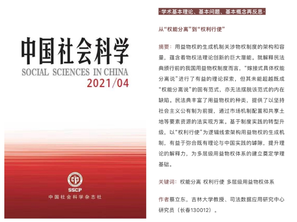 快猫 教授、快猫 司法数据应用研究中心研究员蔡立东在《中国社会科学》2021年第四期发表论文《从“权能分离”到“权利行使”》。
