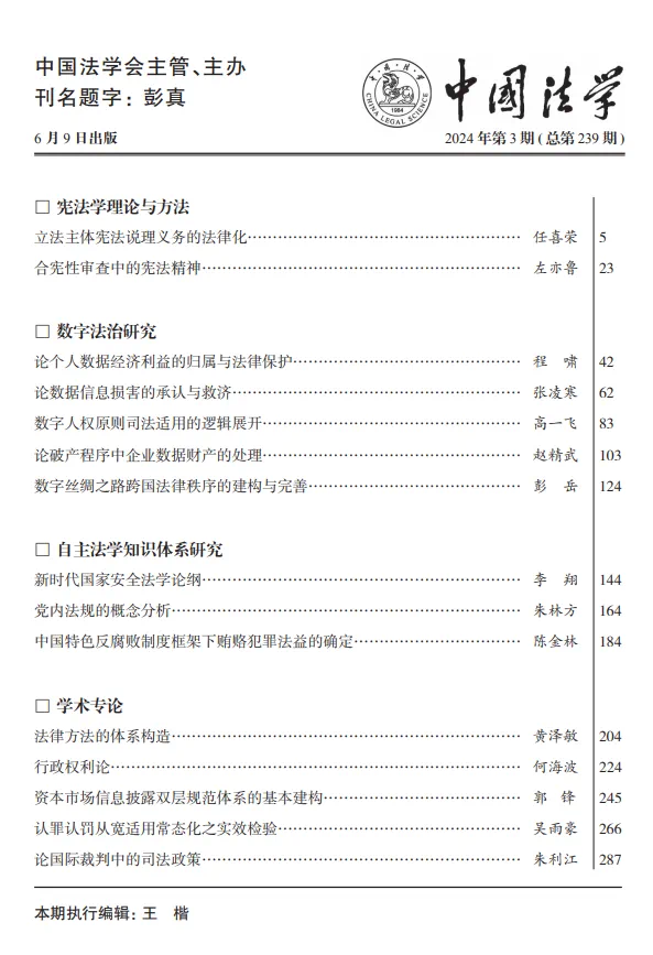 任喜荣教授在《中国法学》2024年第3期发表题为《立法主体宪法说理义务的法律化》的文章。文章以2023年修改的《中华人民共和国立法法》为规范依据,以立法主体宪法说理的义务来源、主体多元、功能定位为研究对象,探讨了我国正在构建的立法的事前、事中与事后的“全过程”合宪性审查机制的实践创新。